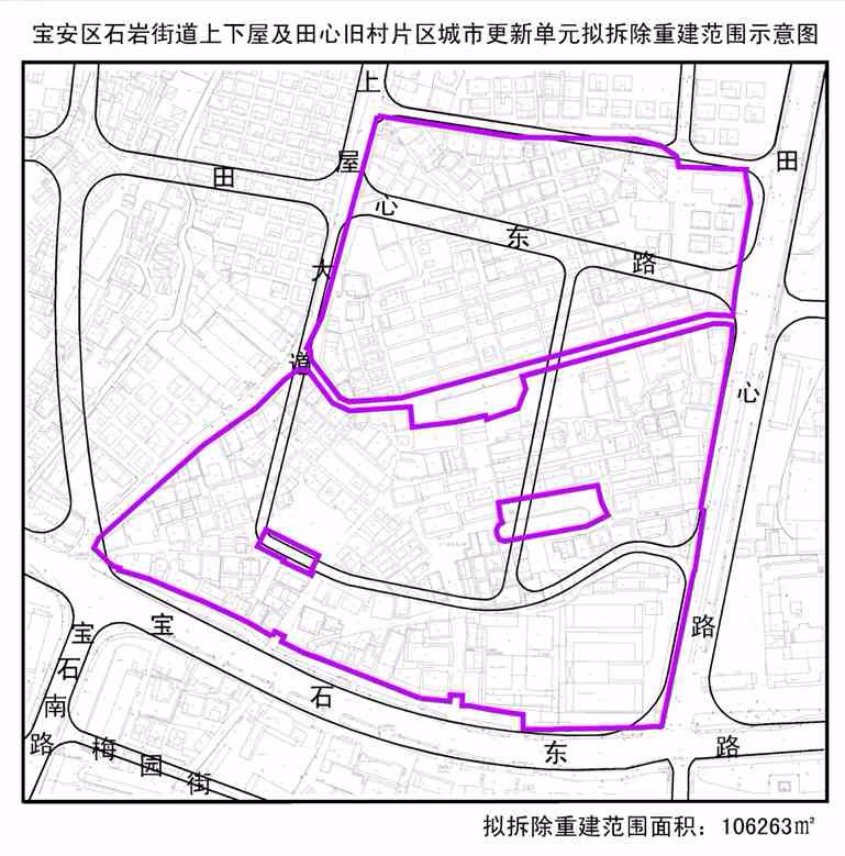 此城市更新单元项目位于深圳市宝安区石岩街道上屋社区田心大道与宝石东路交汇处,更新单元面积为116826平方米,拆除范围用地面积为110226平方米。